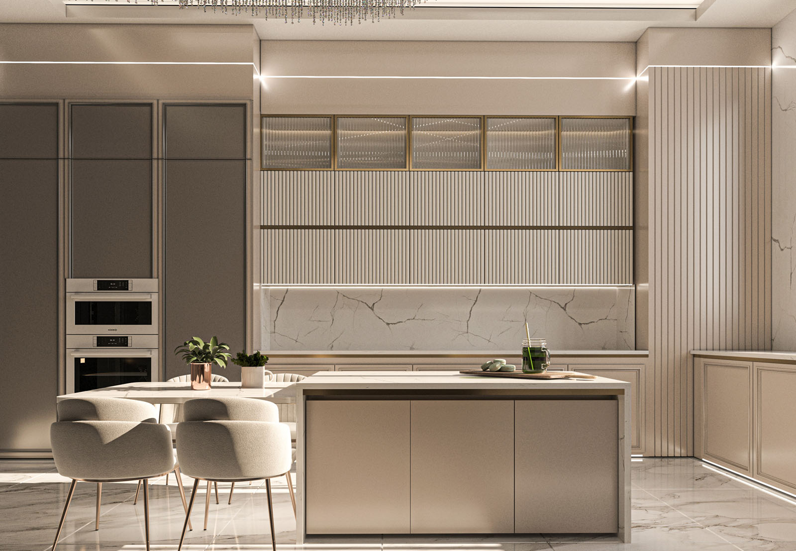 هذه التفاصيل الصغيرة تجعل المطبخ يبدو أكبر وأكثر تنظيماً دون فقدان لمسة الفخامة.